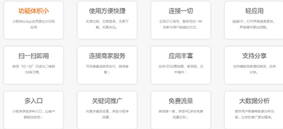 小程序是一种不需要下载安装即可使用的应用,它实现了应用“触手可及”的梦想,用户扫一扫或者搜一下即可打开应用。也体现了“用完即走”的理念,用户不用关心是否安装太多应用的问题。应用将无处不在,随时可用,但又无需安装卸载。对于开发而言,小程序开发门槛相对较低,难度不及APP,能够满足简单的基础应用,hishop小程序开发认为适合生活服务类线下商铺以及非刚需低频应用的转换。小程序能够实现消息通知、线下扫码、公众号关联等七大功能。其中,通过公众号关联,用户可以实现公众号与小程序之间相互跳转。由于小程序不存在入口。[2]